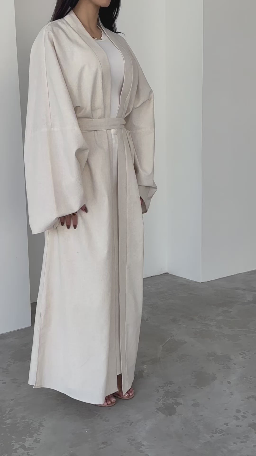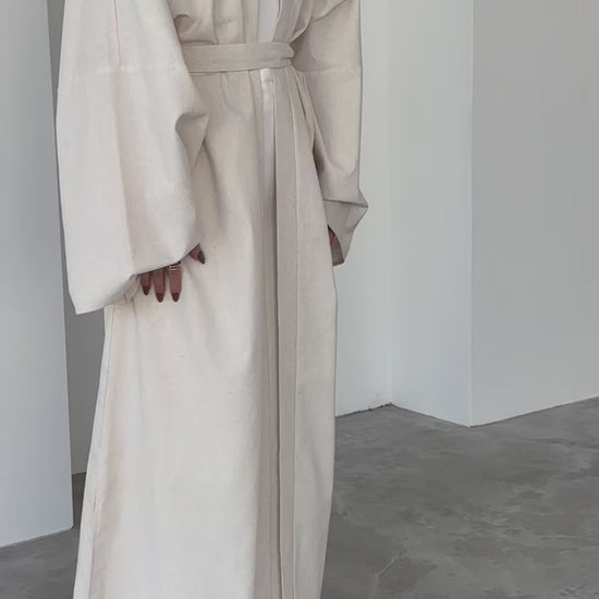 Wrap yourself in luxury with our ASILAH full-length Linen kimono. Inspired by the captivating city, this piece features a waist belt and hidden pockets.
