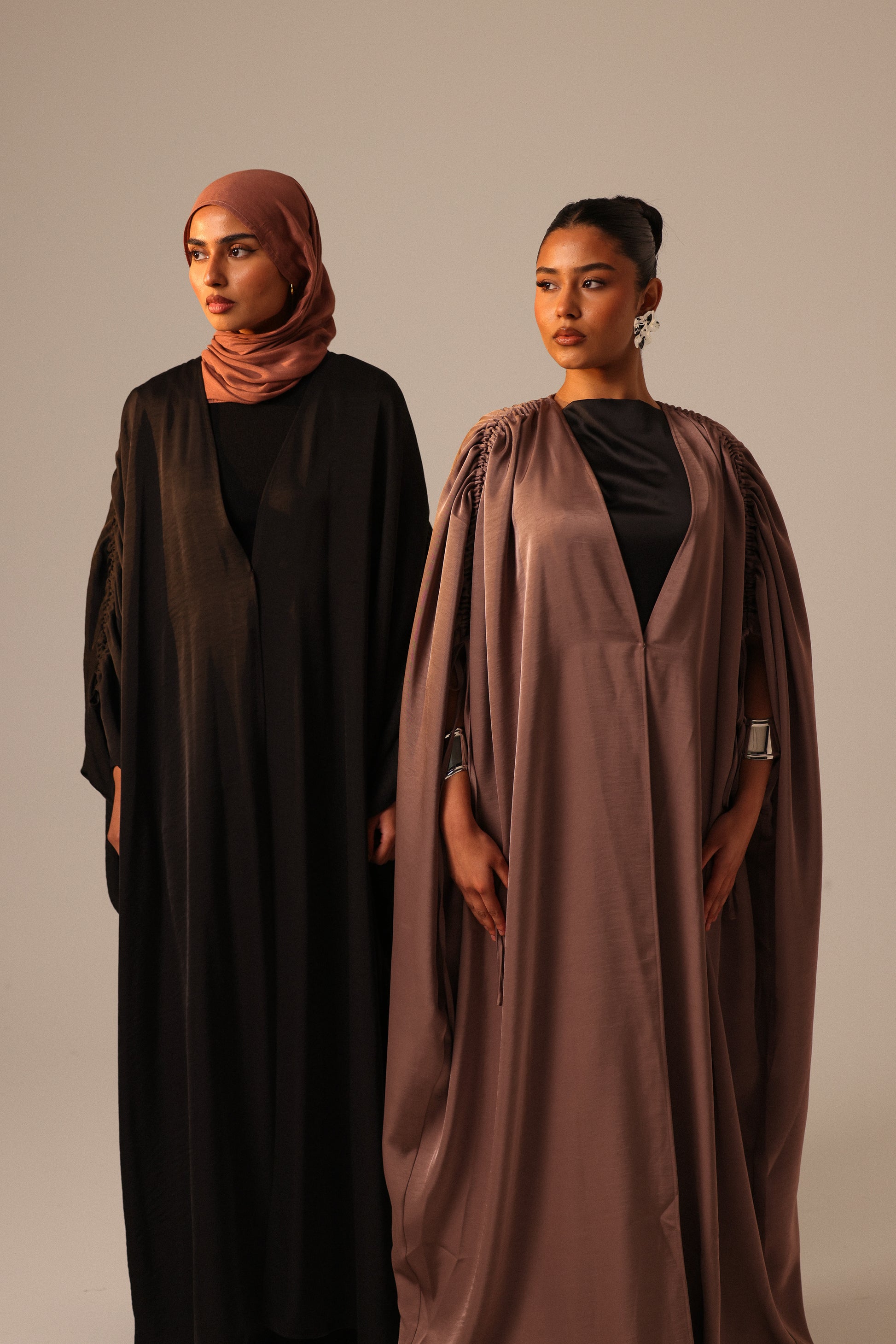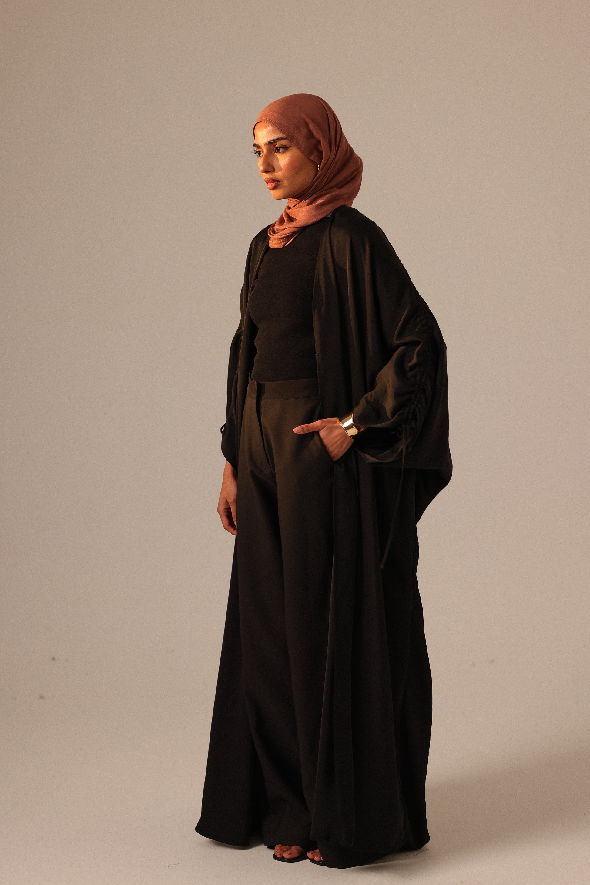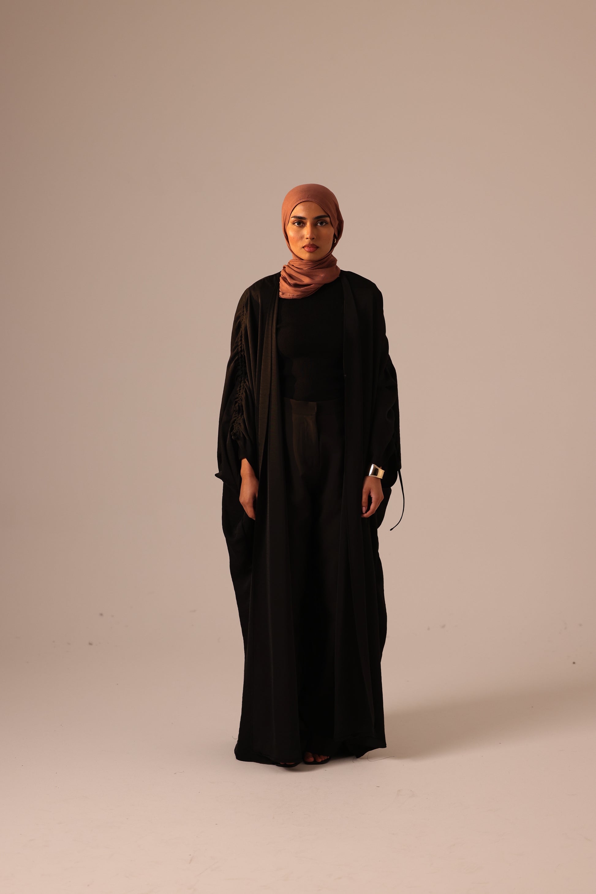 A powerful fusion of poetry and modest fashion, this drawstring batwing abaya is designed to drape effortlessly and move with grace. Featuring a soft silhouette with a subtle front button closure and adjustable drawstring arms