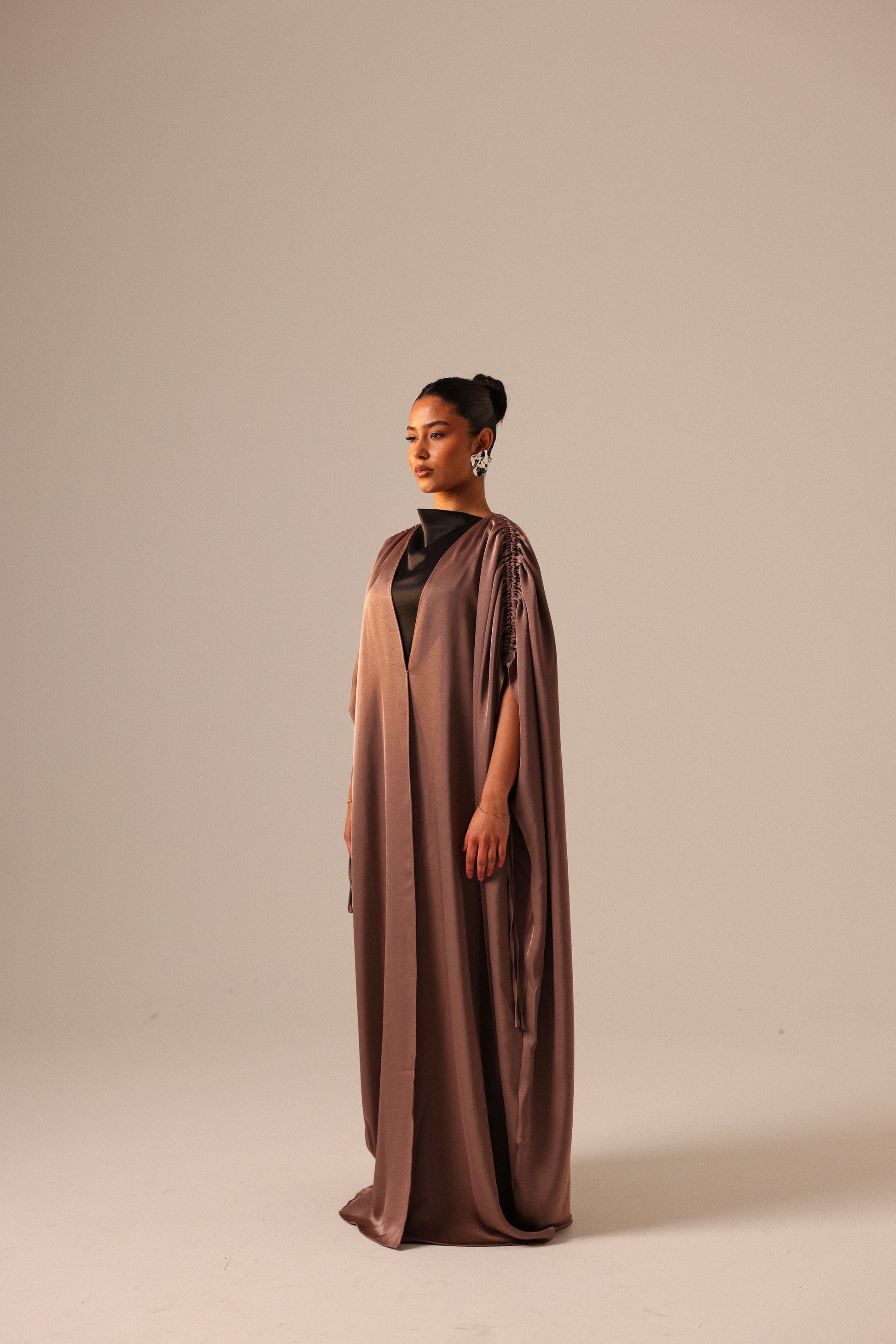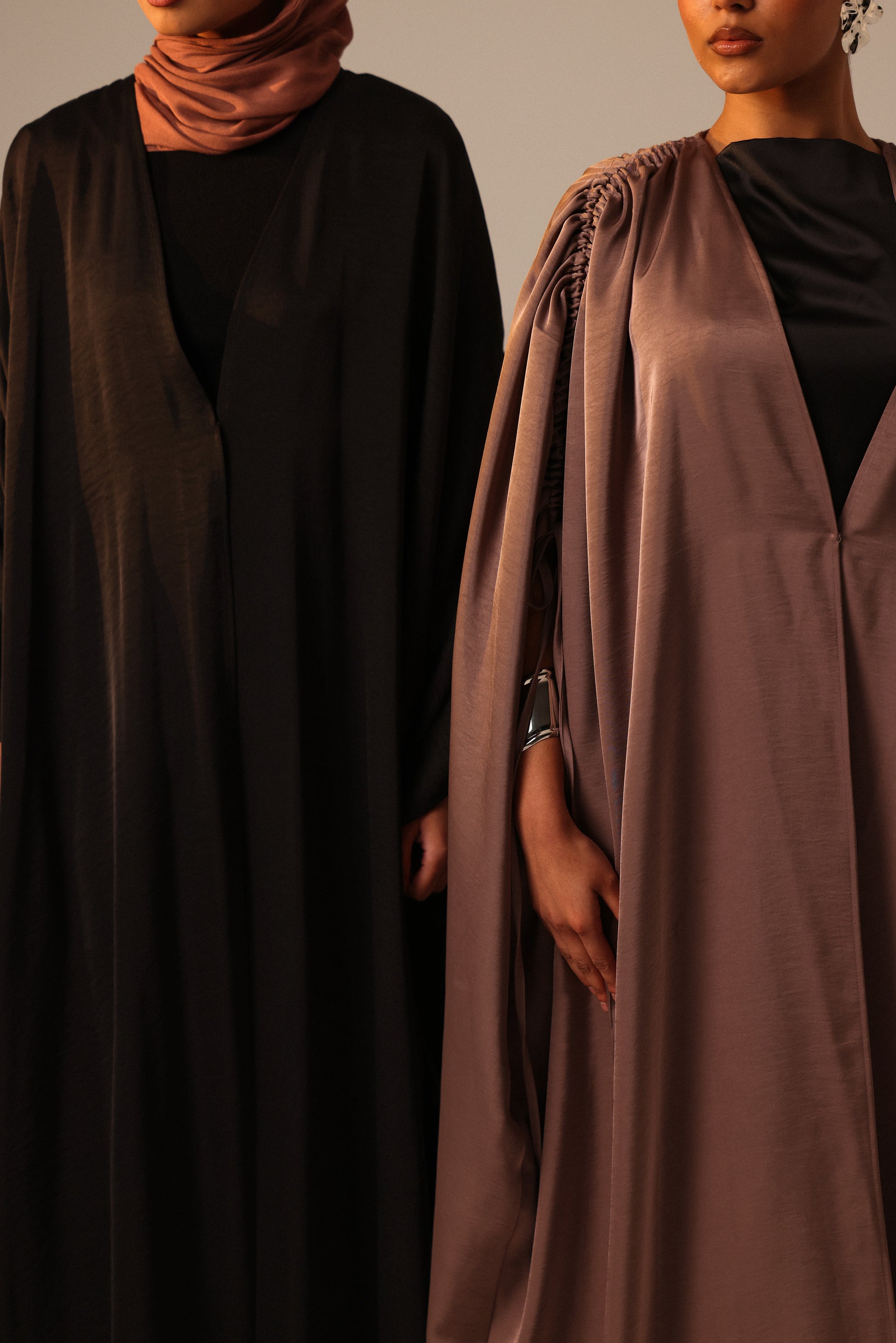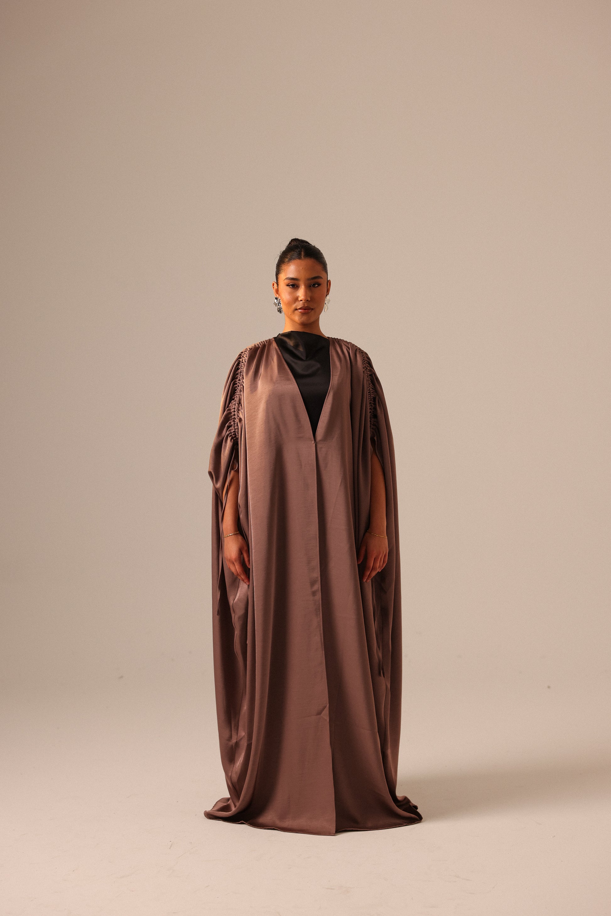 A powerful fusion of poetry and modest fashion, this drawstring batwing abaya is designed to drape effortlessly and move with grace. Featuring a soft silhouette with a subtle front button closure and adjustable drawstring arms
